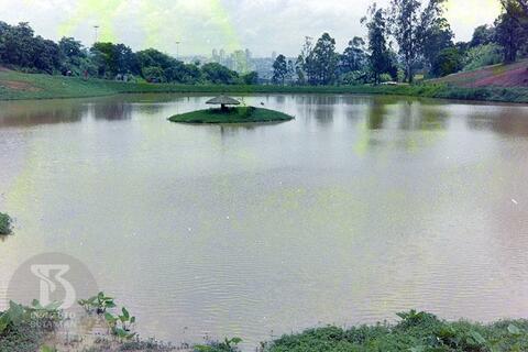 Construção do Parque de Saúde Pública do Instituto Butantan. Vista de um dos lagos construídos com uma pequena ilha, para uso das aves aquáticas que eram atraídas pelo local.