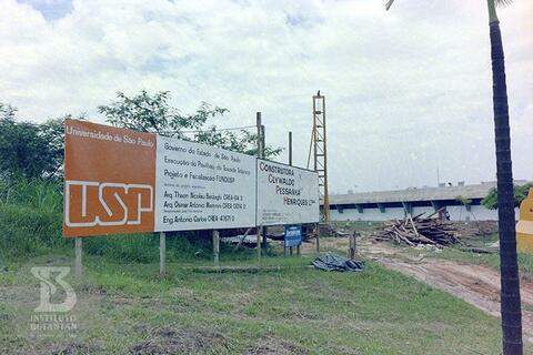 Foto em detalhe de painel de identificação da Construtora Clywaldo Pessanha Henriques LTDA, Obra "Execução do Pavilhão do Toxóide Tetânico"