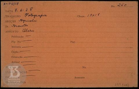 Olaria. Ficha da seção de fotografia nº 260, solicitado pela seção agrícola ( Dr. Arantes). Verso