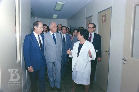 Solenidade de inauguração de novas Instalações do Instituto Butantan. Visita aos laboratórios, em primeiro plano da esquerda para direita, Dr. Willy Beçak, André Franco Montoro, Governador de São Paulo, Dra. Hisako Gondo Higashi, Roberto Figueira Santos, Ministro da Saúde.