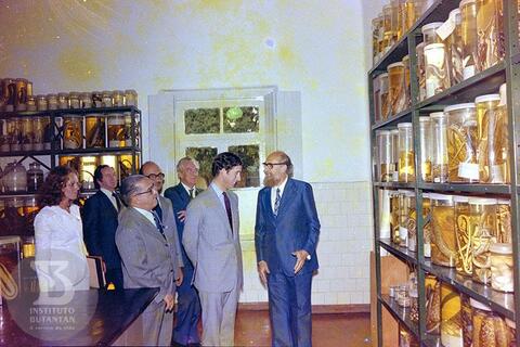 Visita do Príncipe Charles. Da esquerda para direita, 3º Walter Leser, Secretário Estadual de Saúde de São Pauo, 4º Dr. Fauze Carlos (Diretor do Instituto Butantan) 6º Príncipe Charles e 7º Dr. Alphonse Richard Hoge, observando coleção de serpentes.